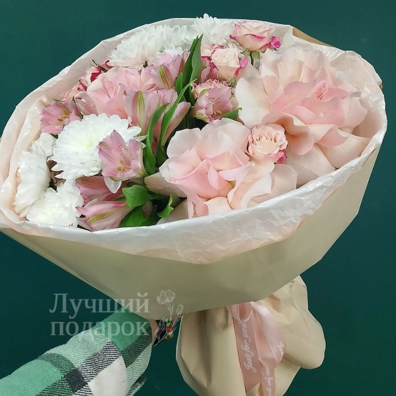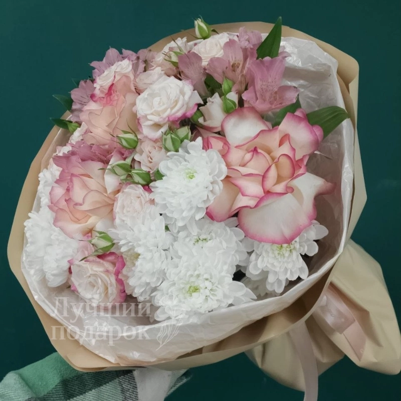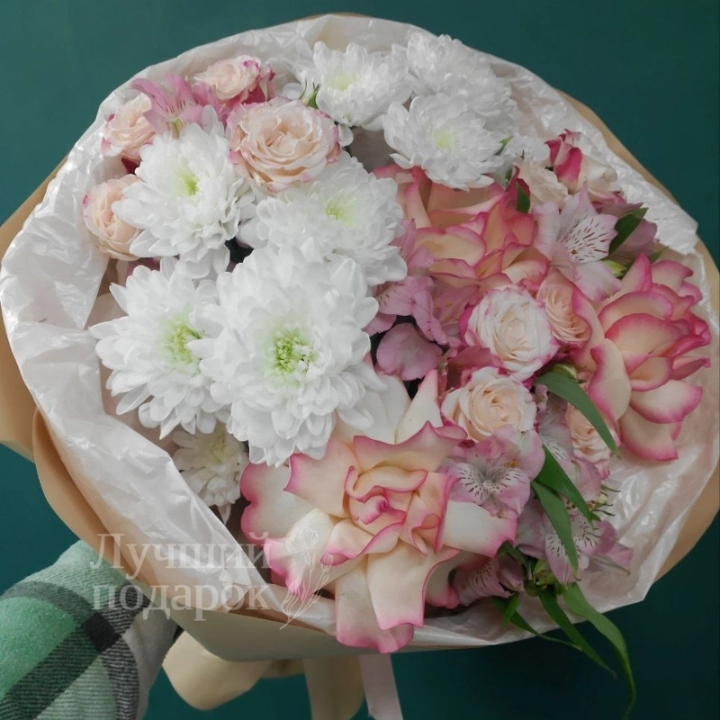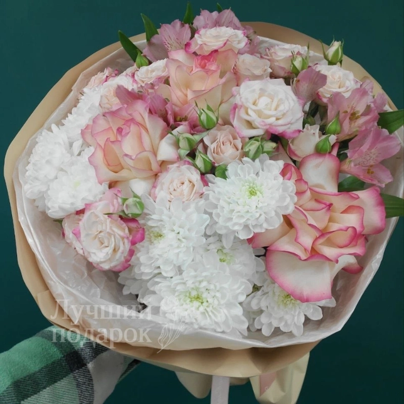 «Жаклин» — это изысканный букет, идеально подходящий для самых особых случаев. В его составе гармонично сочетаются яркая хризантема кустовая и элегантные альстромерии, придавая композиции свежести и насыщенности. Розы, присутствующие в букете, символизируют любовь и тепло, делая ваш подарок особенным. Крупные кустовые розы добавляют объем и выразительность всему ансамблю. Каждый цвет meticulously выбран и подобран для создания гармоничной и привлекательной композиции. Этот букет отлично подойдет как для романтического признания, так и для выражения благодарности. Он долго сохраняет свою свежесть и потрясающе смотрится как в интерьере, так и в качестве подарка. «Жаклин» — это символ красоты, гармонии и искренних эмоций.