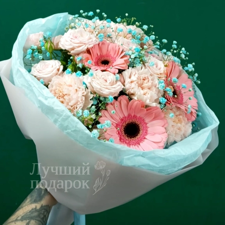 Букет «Сладкий поцелуй» — это изящное сочетание ярких и нежных цветов, создающее романтическую атмосферу. В состав входят кустовые хризантемы, которые придают букету объем и яркость. Легкая гипсофила добавляет воздушности и нежности композиции. Гербера в ярких оттенках придает яркость и насыщенность оформлению. Этот букет идеально подойдет для выражения любви и теплых чувств. Его привлекательный дизайн подчеркнет особую важность момента. Букет выполнен из свежих и качественных цветов, обеспечивая долгий срок красоты. Он прекрасно подойдет в качестве подарка на День рождения, годовщину или просто, чтобы порадовать близкого человека. Оформление гармонично сочетает в себе красоту и изысканность, создавая неповторимую атмосферу праздника.